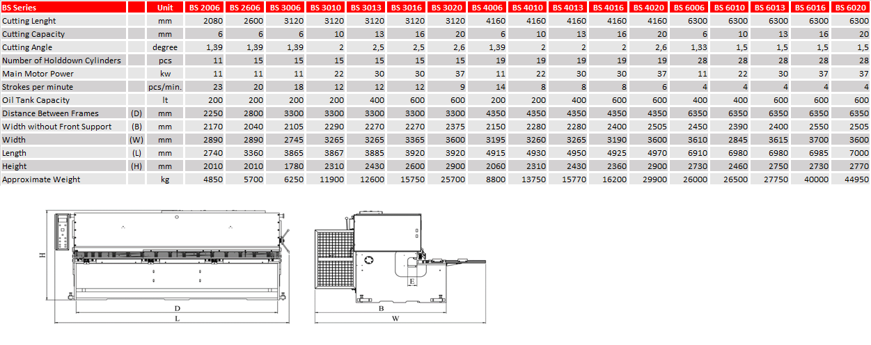 Гидравлические гильотинные ножницы компании DENER имеют прочную сварную конструкцию, рассчитанную для ежедневного использования на протяжении длительного срока службы. Конструкция станины, режущих ножей, заднего упора обеспечивают высокую жесткость, сопротивление к скручиванию и деформациям. Вместе с прочной конструкцией покупатель получает наивысшее качество резки. Все рабочие движения гильотинных ножниц (рабочий ход верхнего ножа, прижимы листа, возвратный ход) осуществляются с помощью гидравлического привода. Гидравлические гильотинные ножницы DENER модели BS имеют ручную регулировку зазора между ножами, настройку длины реза с помощью числового контроллера (ЧК). Память контроллера рассчитана на 99 программ. В каждой программе можно задать до 20 позиций положения заднего упора. Модельная линейка гильотинных ножниц компании DENER в стандартной комплектации рассчитана на раскрой листа с максимальной толщиной от 6 мм до 20 мм и длиной от 2 м до 6 м. По специальному заказу DENER может изготовить гильотинные ножницы с другими характеристиками.